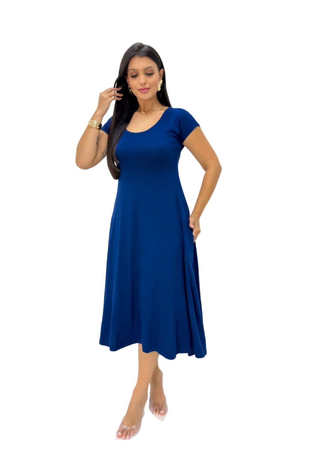 Vestido midi com babado na barra azul marinho , com manga curta, confeccionado em viscolycra . Vestido ideal para dias quentes. . Ótima opção para ficar bem vestida e elegante com uma única peça.
